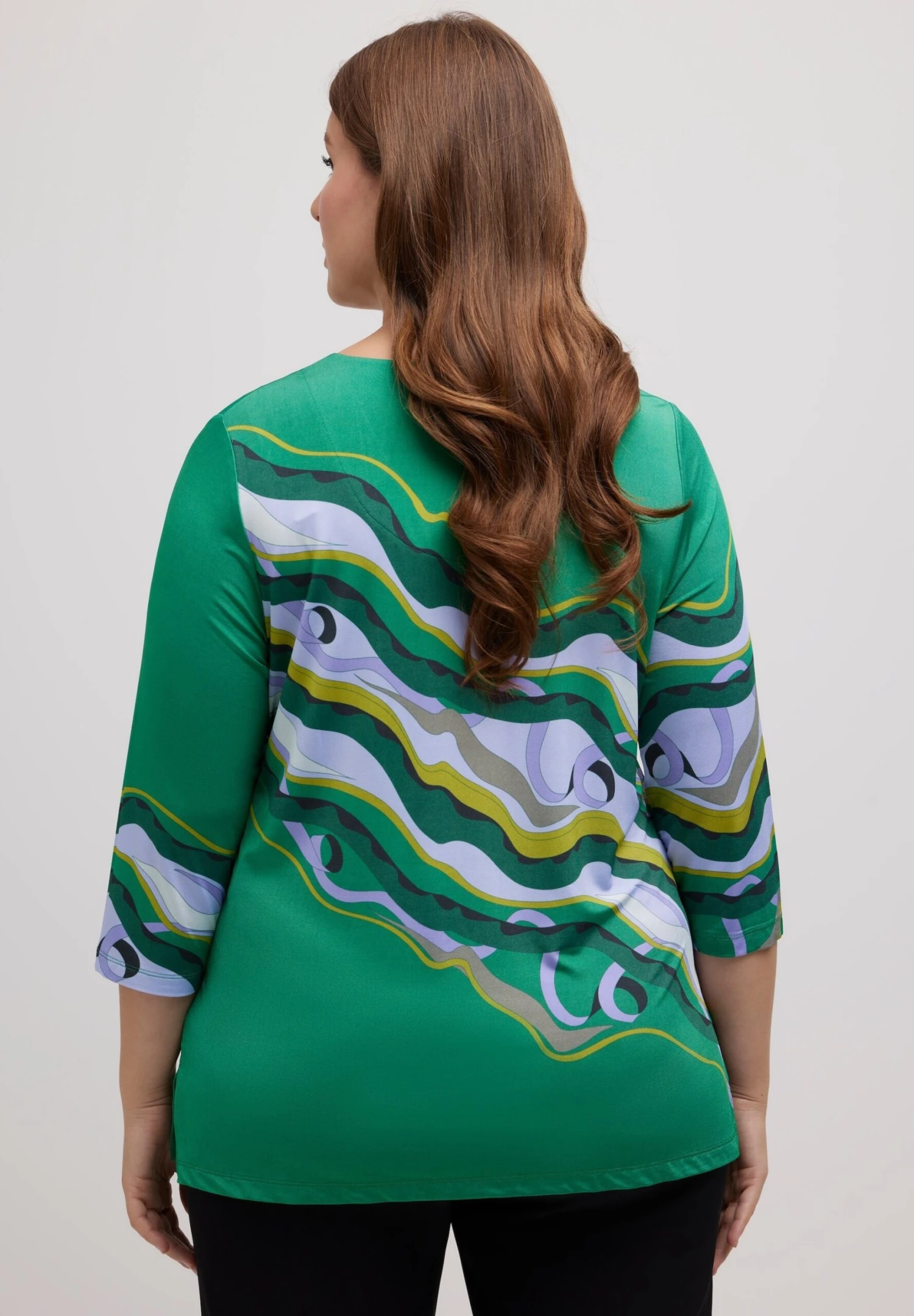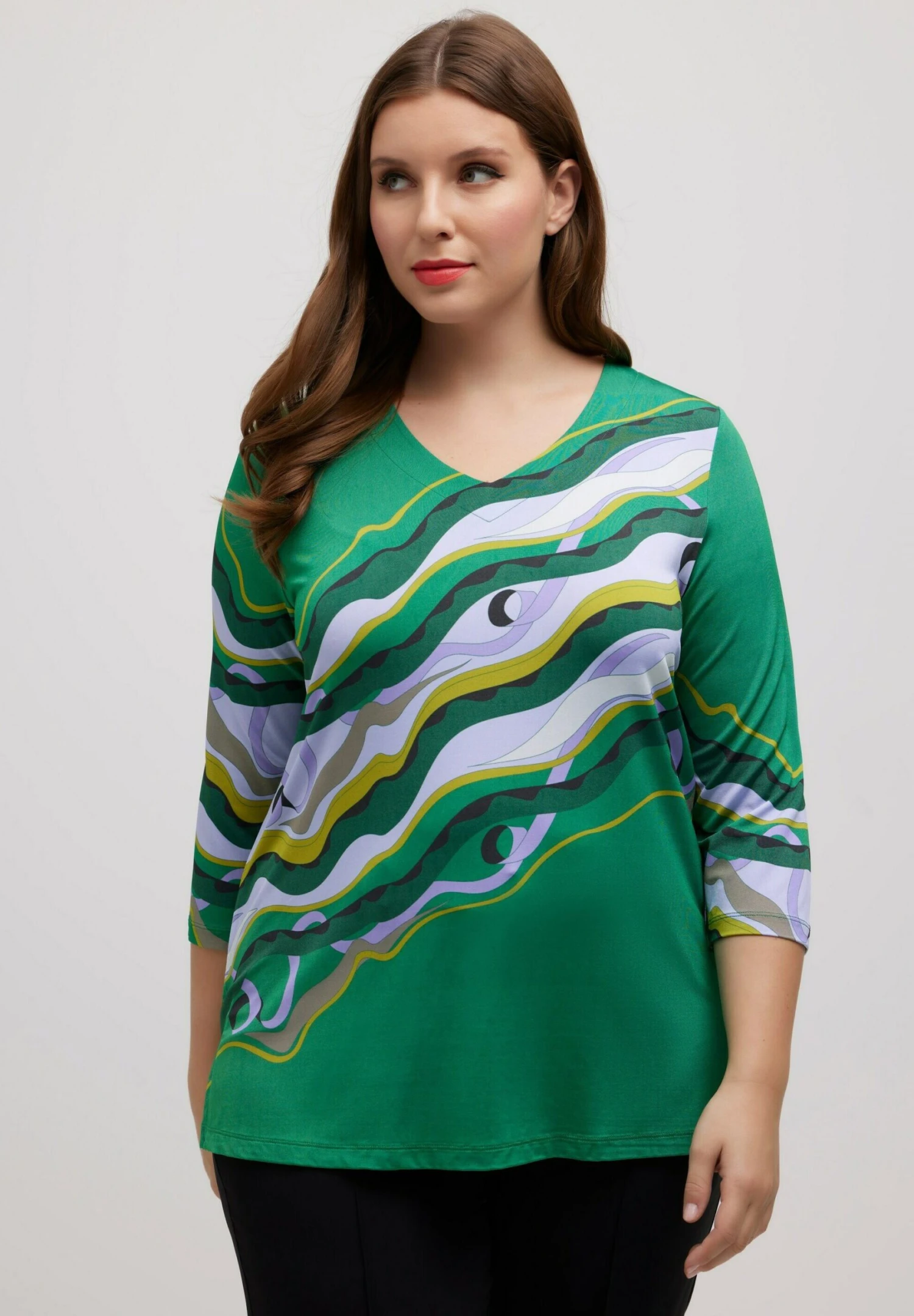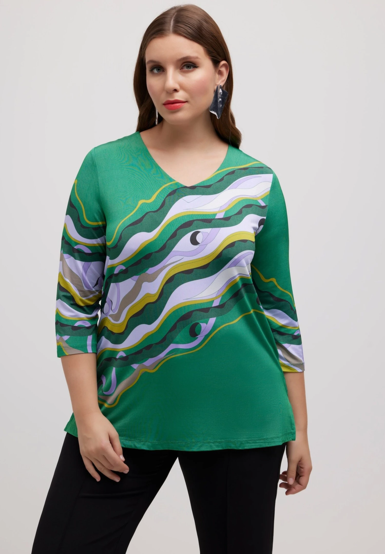 Ulla Popken Fluide Motif Marbré Col En V Manches 3/4 – Longsleeve – Turquoise Green Multi